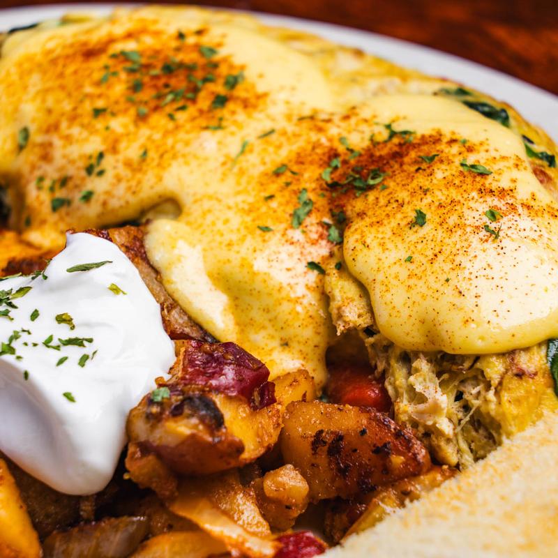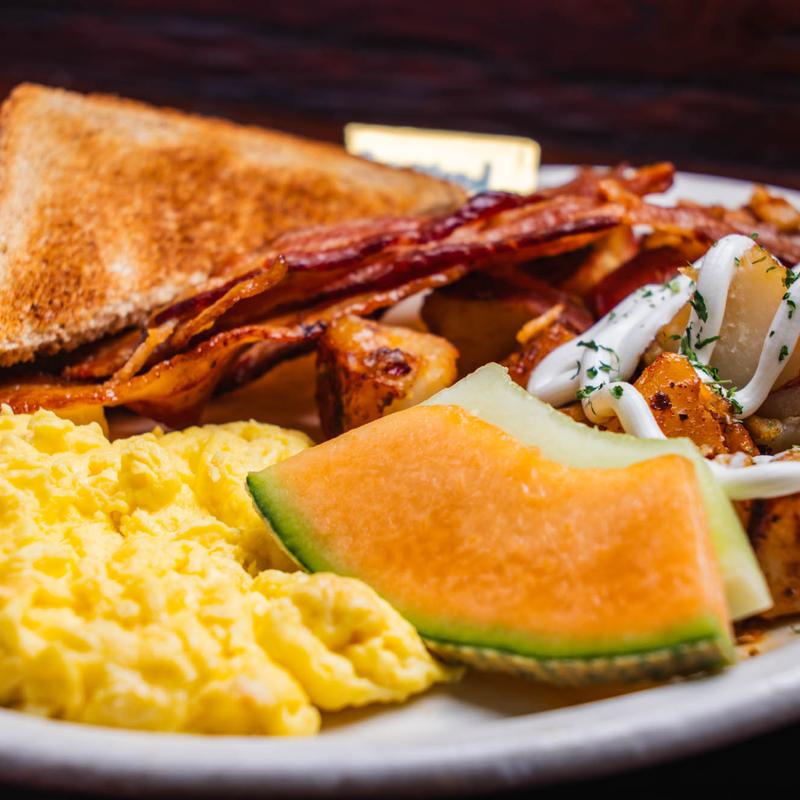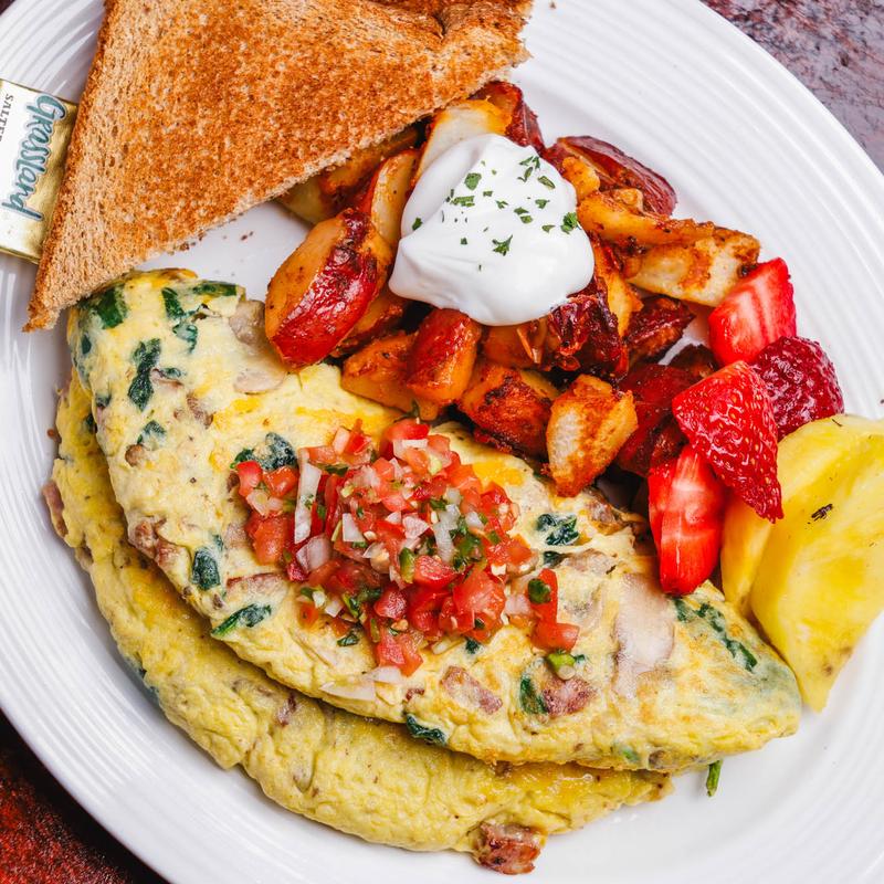 Served anytime | All egg dishes except huevos rancheros, chicken fajita scramble, hot links scramble are served with house potatoes, topped with sour cream and your choice of an English muffin, wheat, sourdough, or white toast • Add Bagel +$2.50 | Sub Egg White +$3.50 | Sub Fruit for Potatoes +$4.00 | Split Plate +$2.00 • No sub in weekend and holiday please.